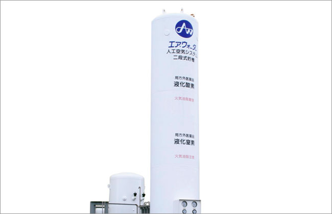 許の二段式CEでは酸素と窒素の貯槽を一つの外槽内に組込み、1基のCEで2基分の貯槽能力を実現しています。